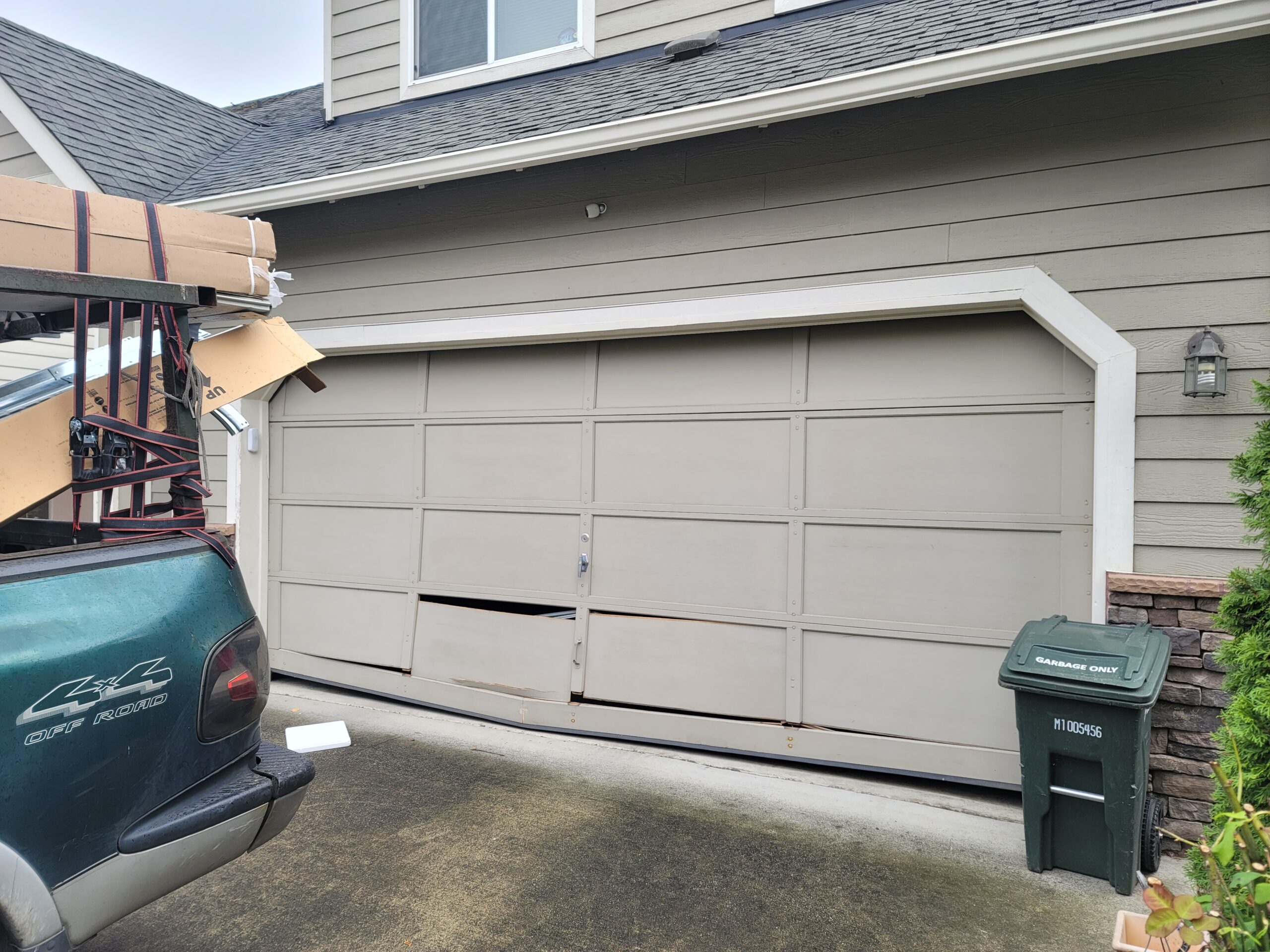 Understanding common causes helps prevent future damage: Vehicle impact - Accidentally backing into the door is the most frequent cause of panel damage Sports equipment - Basketballs, baseballs, and soccer balls create dents and cracks Hail and storms - Severe weather causes pitting, dents, and structural cracks Age and wear - Garage doors have a 15-30 year lifespan; older doors show more panel deterioration Moisture and weather exposure - Rain, snow, and humidity cause rust on steel panels and warping on wood Mechanical issues - A broken spring creates uneven stress, potentially damaging multiple panels Impact from stored items - Tools and equipment leaning against the door cause gradual damage Regular maintenance and careful use extend panel life significantly.